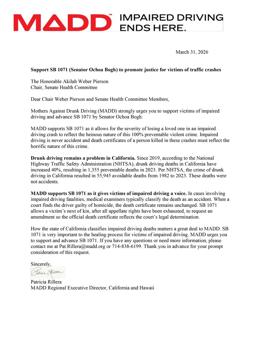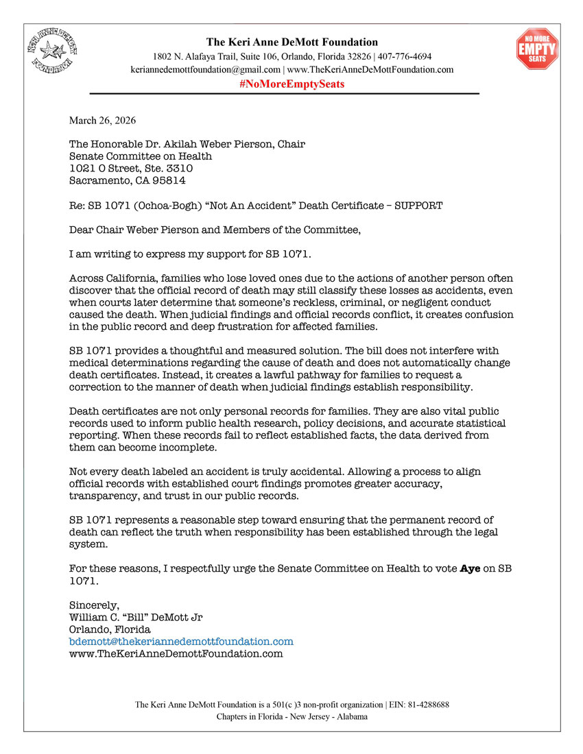 Those who have been directly impacted can personalize the letter by sharing their experiences, urging the committee to pass SB 1071 so that official records reflect the truth about how their loved one died.